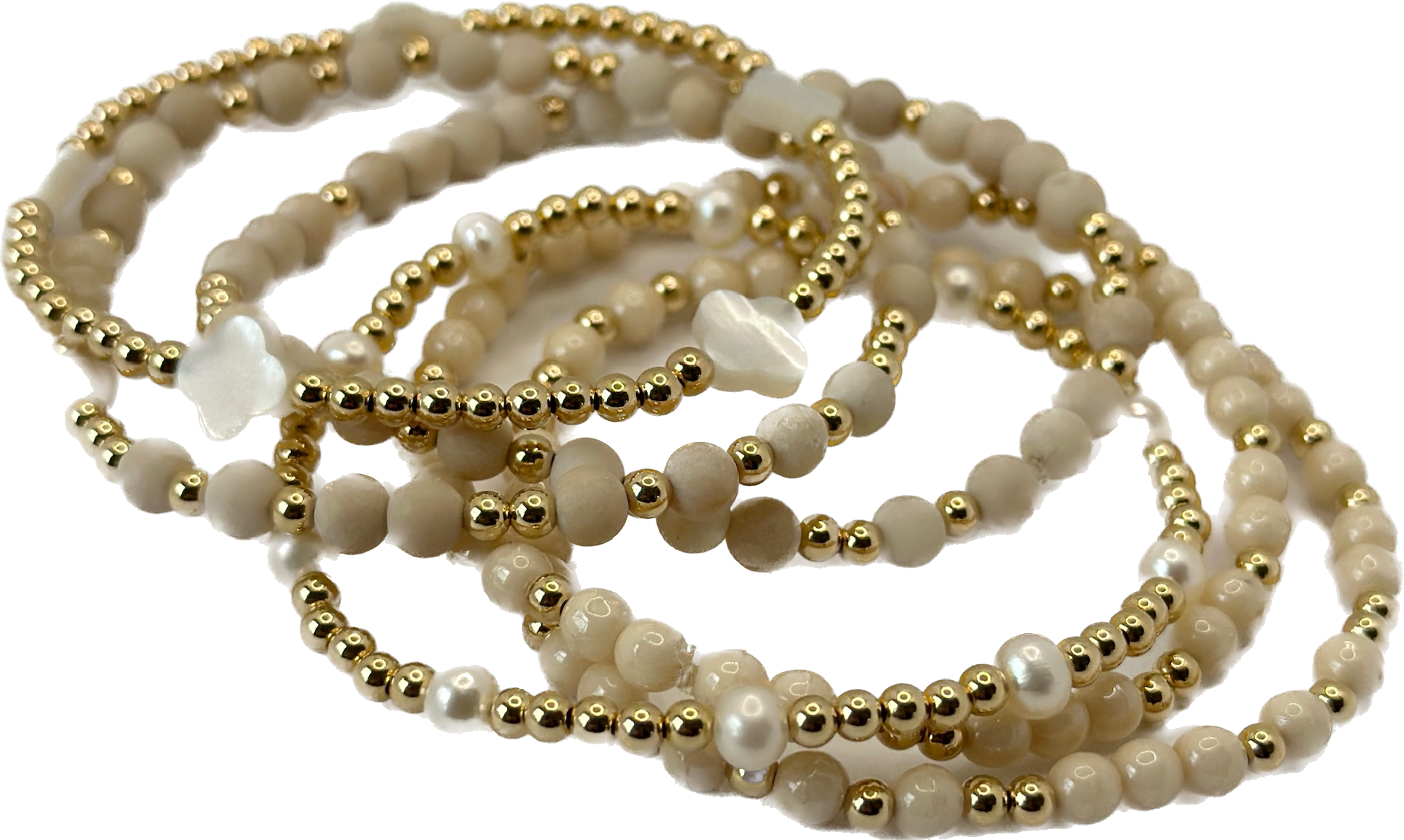 Behold the elegance of the Drew Bracelet - a fine, stackable accessory crafted with luxurious mini Mother-of-Pearl clovers and gold-filled beads. Its timeless design adds a touch of subtle sophistication and class to any outfit, elevating it to an artful expression of style.