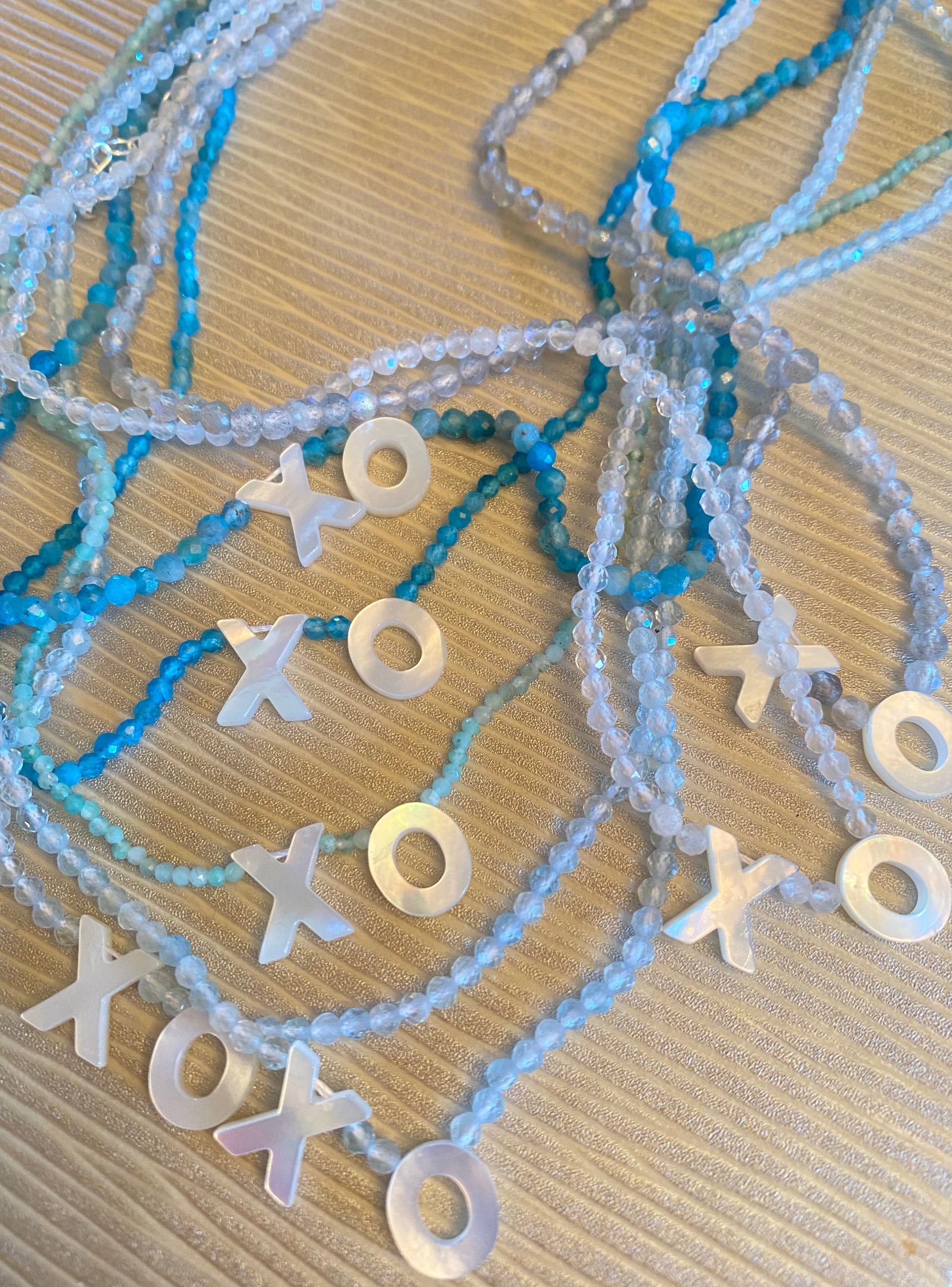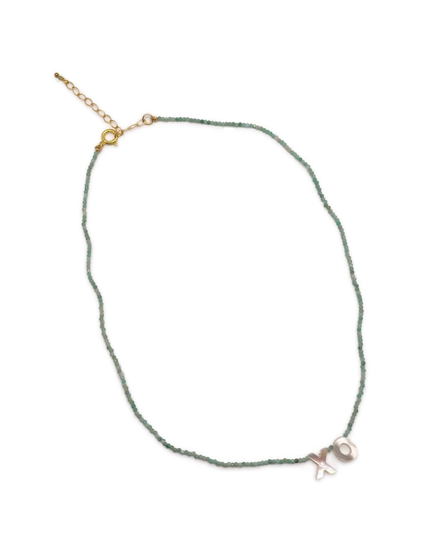 We love our Juanita necklace with mother-of-pearl XO letters and semi-precious stones. It's an outstanding piece alone or stacked with other pieces.